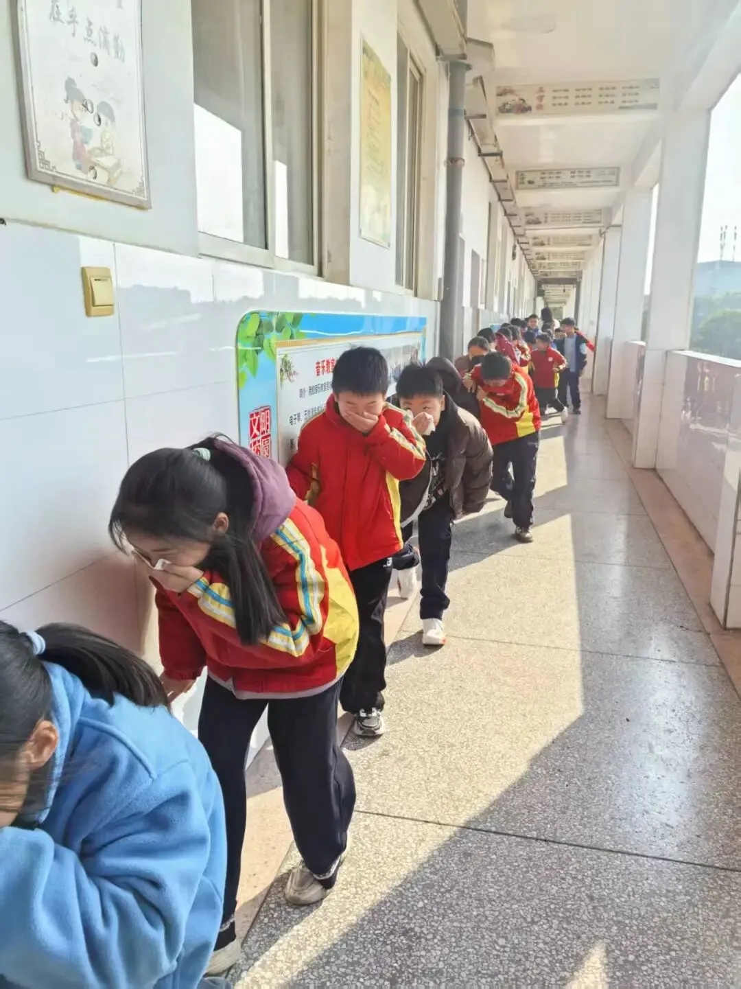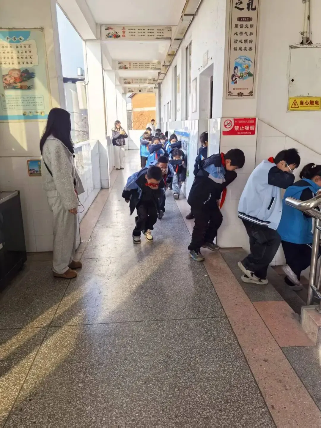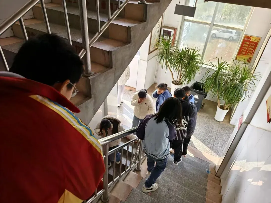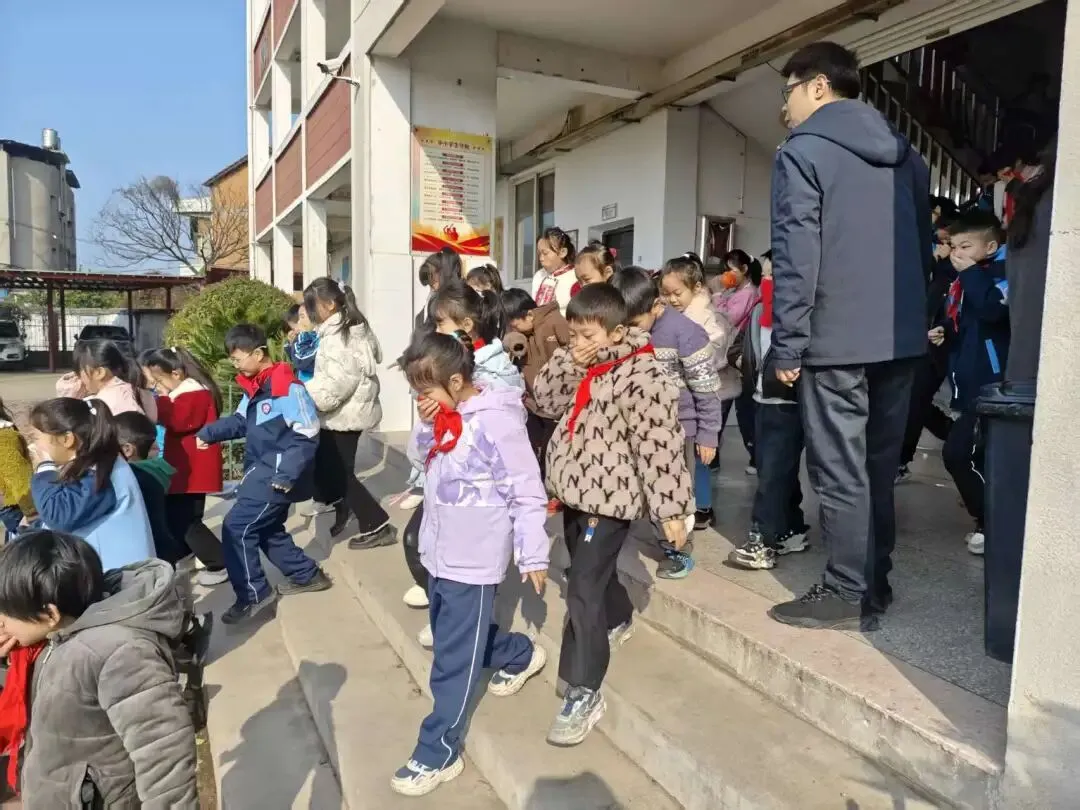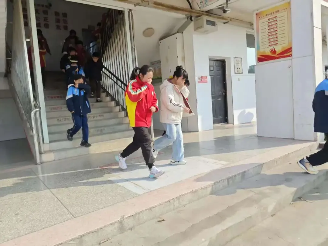 随着警报声的响起,各班级学生在班主任的组织下,迅速做出反应。学生们用湿毛巾等物品捂住口鼻,弯腰低姿,按照“前三后四”的路径有序撤离教室。疏散过程中,教师们在队伍前后引导和保护学生,提醒学生注意安全,防止拥挤踩踏事故的发生。