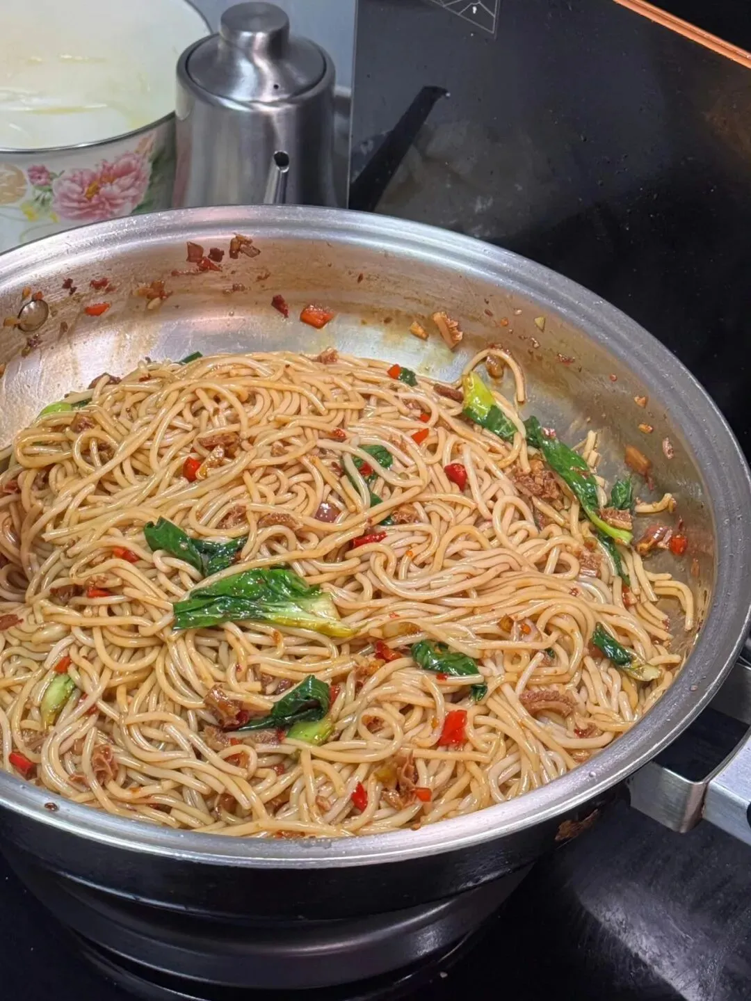 一开始我还半信半疑,不就是拌个粉吗,能好吃到哪去啊。结果拌开我直接人傻了,每一根粉都油亮亮的,裹满了酱,零零碎碎的肉丁红辣椒散在缝里,我还随手丢了两把家里剩的小青菜,这颜色看着就诱人,香味直往鼻子里钻,给我馋的都快流口水了。