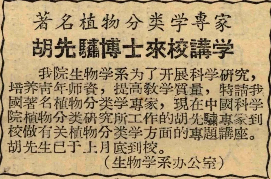 林英启程留苏前,中正大学首任校长、生物学系的缔造者胡先骕于5月31日下午3点抵达南昌,应邀在师院讲学三个星期。此时距党中央发出“向科学进军”号召才一年,为了“活跃学术风气”,胡先骕以“著名植物分类学专家”的身份受邀举行植物分类专题讲座。讲座从6月3日持续到30日,每周三次,每次讲座一下午。讲学内容分三个专题:栽培植物的起源、塔赫他间的被子植物的起源、水杉的发现及其重要科学意义。这是胡先骕于1946年离昌后首度回校,也是最后一次。