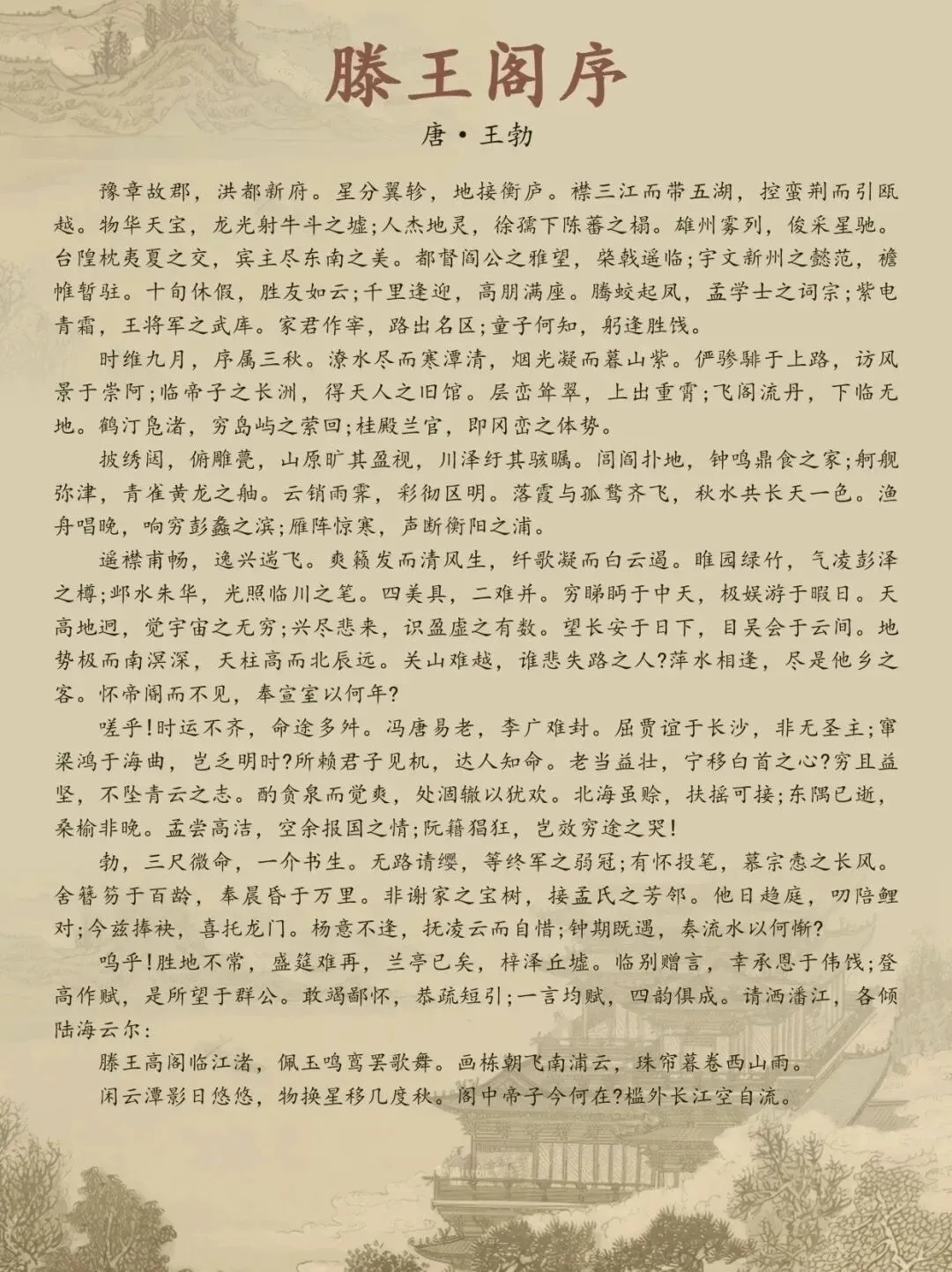 豫章故郡,洪都新府。星分翼轸,地接衡庐。襟三江而带五湖,控蛮荆而引瓯越。物华天宝,龙光射牛斗之墟;人杰地灵,徐孺下陈蕃之榻。雄州雾列,俊采星驰……