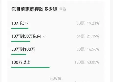 看到一则投票,‘你目前家庭存款多少呢?’,这是一位南昌的博主发起的,然后300多人参与,竟然有接近一半的家庭存款超过100万……