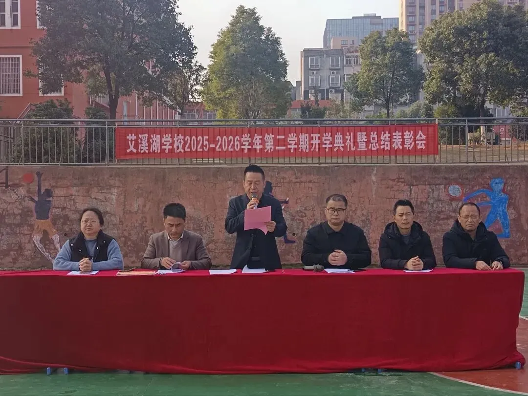 春回大地,万象更新。伴着和煦春风与朗朗书声,我们重返美丽校园,共同开启2026 年春季学期的崭新征程…… 胡长文校长饱含深情的致辞,将现场氛围推向高潮。他回顾过去一年,全校师生同心同德、砥砺前行,在各项工作中取得了可喜成果,并向全体师生的辛勤耕耘与不懈付出致以诚挚感谢。他指出,成绩已然属于过往,新征程更需奋勇争先。2026 年既是新起点,也是新挑战。胡校长对全体师生寄予殷切期望:愿大家以更昂扬的斗志、更务实的作风、更饱满的热情,凝心聚力、笃行不怠,以实干笃定前行,以奋斗追逐梦想,共同谱写艾溪湖中学更加灿烂辉煌的崭新篇章!