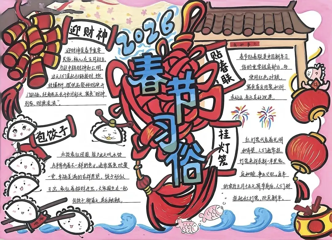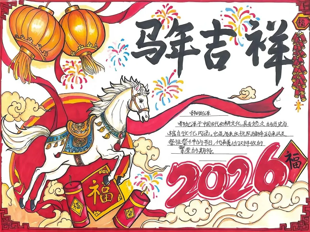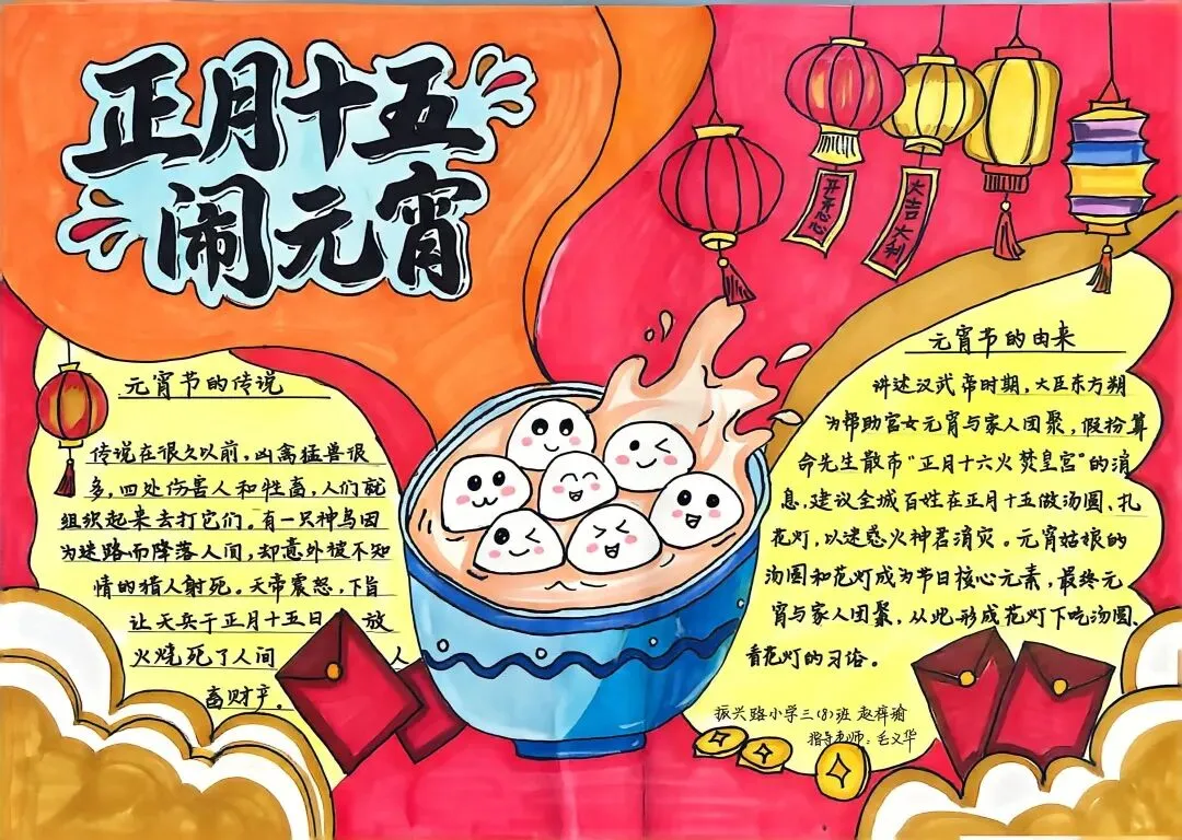 在创作过程中,同学们充分发挥想象力与创造力,一幅幅作品版面整洁、主题鲜明、图文并茂。灵动的笔触勾勒出节日的热闹景象,鲜艳的色彩描绘出对家国的热爱,既展现了春节元宵的传统韵味,又彰显了新时代少年的审美素养与动手能力。每一笔都充满童趣,每一幅都饱含深情。经过评选,一批优秀作品脱颖而出,并在校园内进行了集中展示,让“年味”在校园里延续。