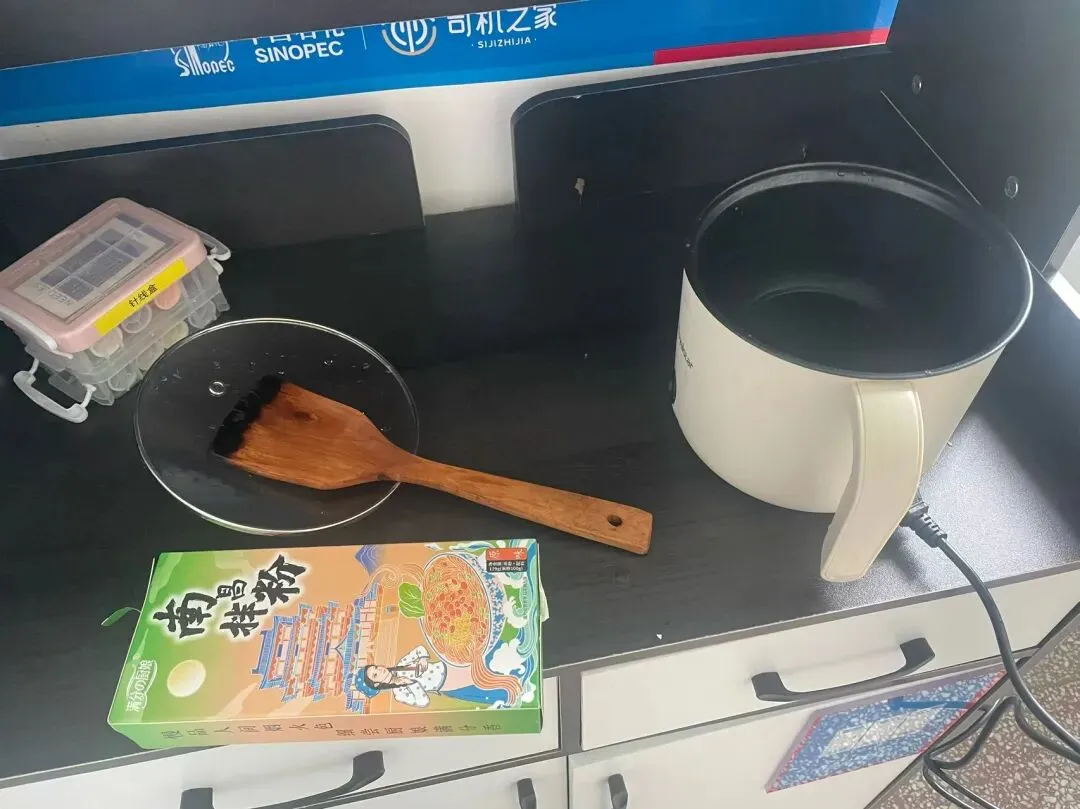 把油箱加🈵,洗了个滚烫的热水澡,还顺便把穿了一天的衣服塞进洗衣机。坐在休息区等衣服烘干时,旁边的大哥在吃泡面,而我拿出来小电锅煮一碗自己带来的南昌拌粉