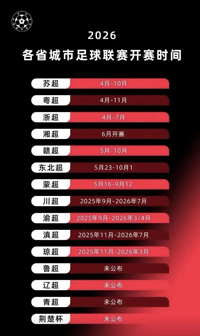 2026年是名副其实的“省超大年”。随着城市足球联赛在全国遍地开花,各省份的赛程计划也已陆续出炉,足球热潮即将席卷大江南北: