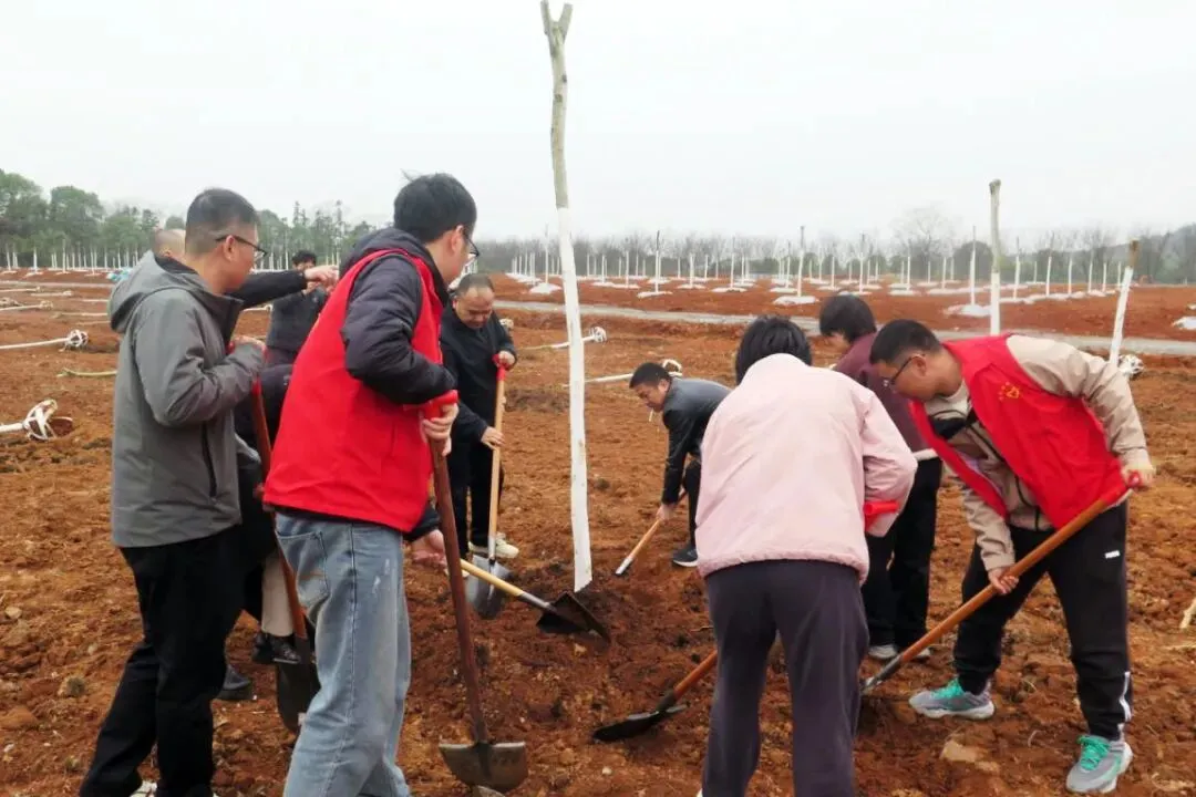 植树现场,旗帜飘扬,一派热火朝天的忙碌景象。参加植树的干部职工们热情高涨、干劲十足,大家三五成组,分工协作,配合默契。挥锹铲土、扶苗填坑、培土围堰、提水浇灌,每一道工序都做得一丝不苟、认真细致。经过一番辛勤劳作,100余株新栽下的无患子、樟树等苗木迎风挺立、错落有致,在春日暖阳中焕发出勃勃生机,为初春的大地播撒下绿色的希望。