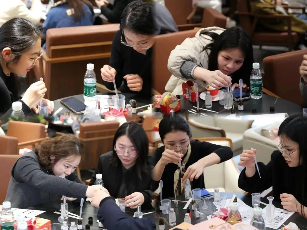 活动另一大亮点是“专属香水DIY”。员工们化身“气味艺术家”,用心挑选自己心仪的前、中、后调香氛,通过比例调配、嗅觉测试,创作出独一无二的个性香水。玫瑰与雪松的碰撞,白茶与茉莉的交融,每一瓶香水都承载着自己的情感与故事。大家调制的不仅是一瓶香水,更是送给自己的一份仪式感。