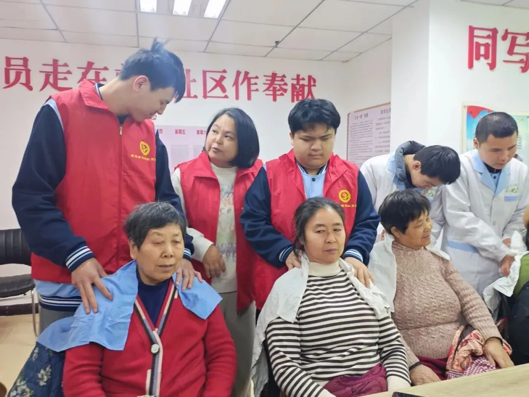 3月5日,在第62个学雷锋纪念日到来之际,南昌市特殊教育学校视障部高二年级学生走进和苑小区,开展“学雷锋·送健康”义务按摩志愿服务活动,用专业技能服务社区居民,以实际行动践行新时代雷锋精神。副校长梅雪、教务处副主任张旻旻、政教处主任李静及按摩专业教师康文珍共同参加活动。