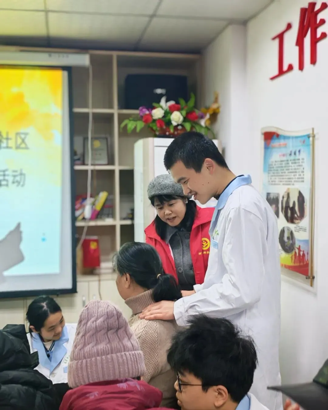 下午2点,和苑小区活动中心暖意融融。学生们在按摩专业教师的指导下,准备好按摩巾,以饱满的热情迎接前来体验的居民。虽然视力受限,但学生们凭借扎实的专业功底和细致的触觉感知,为居民们提供了颈肩推拿、穴位按压等专业按摩服务。