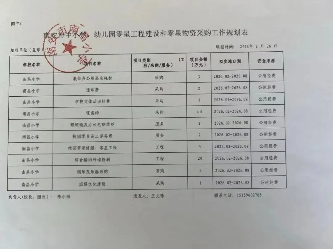 根据《南安市教育系统零星工程建设和零星物资采购管理规定》(南教综〔2021〕119号)精神,为全面加强学校财务管理和监督,切实规范财务行为,防范财务风险,提高教育资金的使用效益。现将我校2026年春季零星工程建设和零星物资采购规划进行公示,公示情况如下: