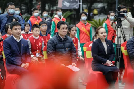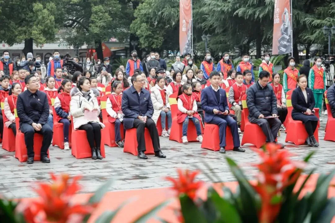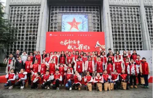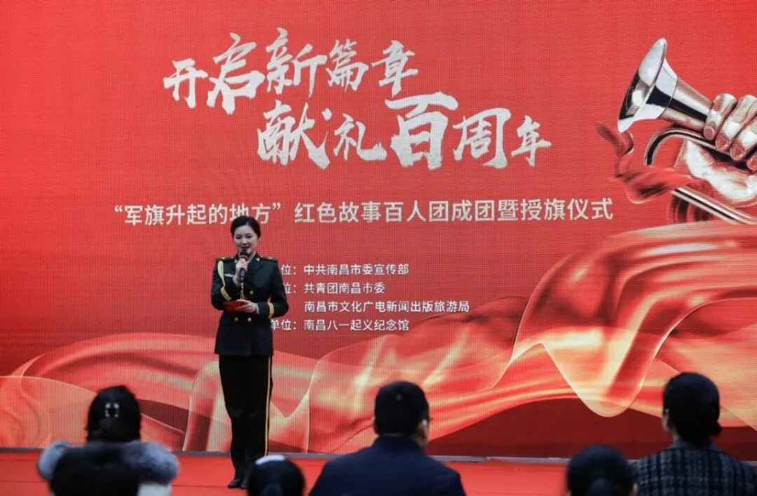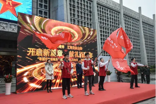 团市委书记刘众星、市文广新旅局局长万利平、市委宣传部副部长张敏、八一馆馆长王小玲共同宣布百人团成团并向团队代表授予队旗
