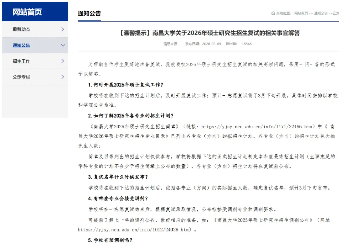 为帮助各位考生更好地准备复试,南昌大学昨日公布《【温馨提示】南昌大学关于2026年硕士研究生招生复试的相关事宜解答》