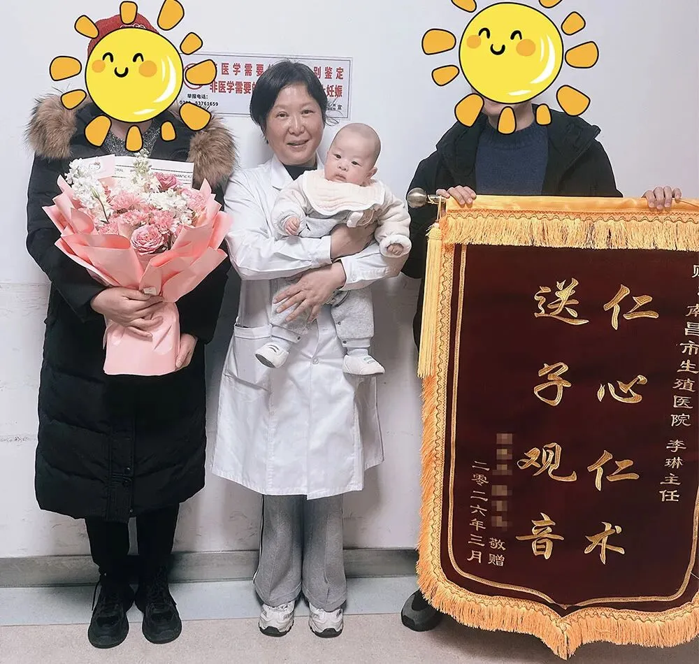近日,来自南昌本地的程慧 (化名) 女士与胡林 (化名) 先生抱着心心念念的男宝,专程来到南昌市生殖医院,向生殖医学科李琳主任报喜致谢并赠送鲜花和锦旗,感谢医院助力他们圆梦再生,让家中两个女儿添上弟弟,成功凑成“好”字。