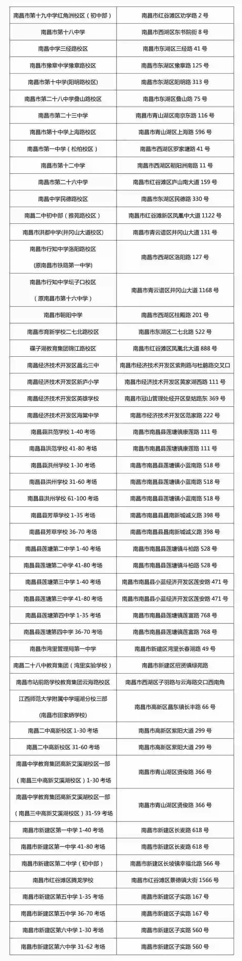 南昌考区共设置40所学校,52个考点,具体地址如下: