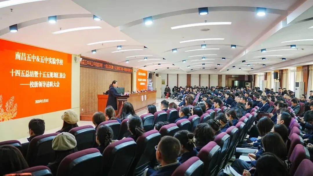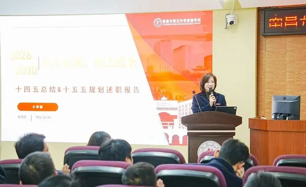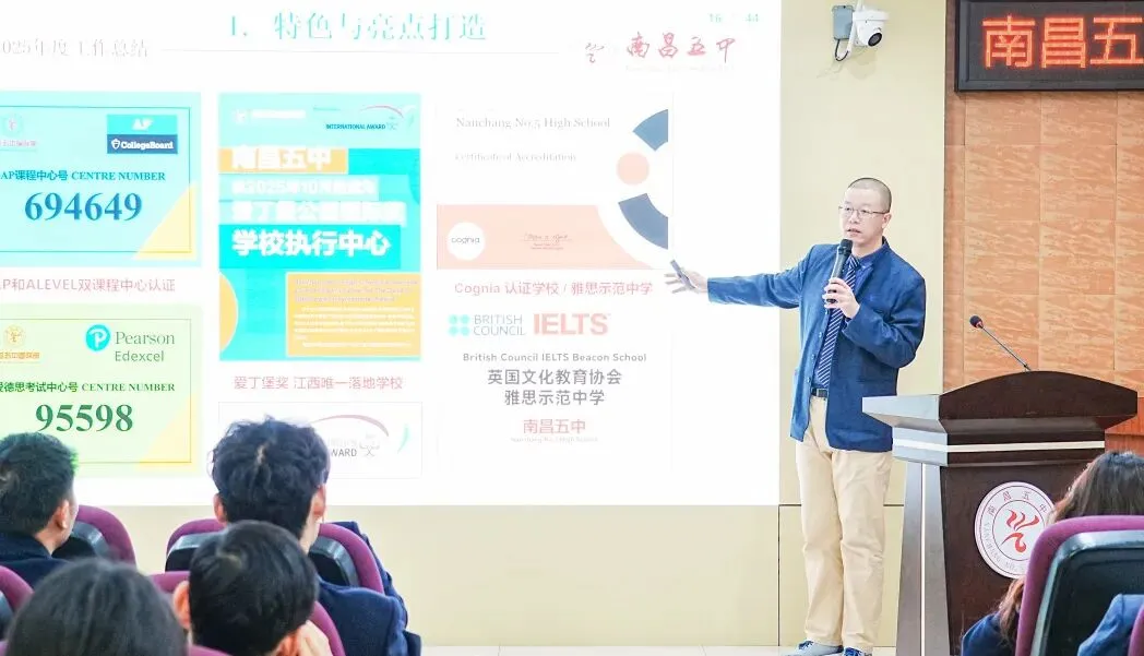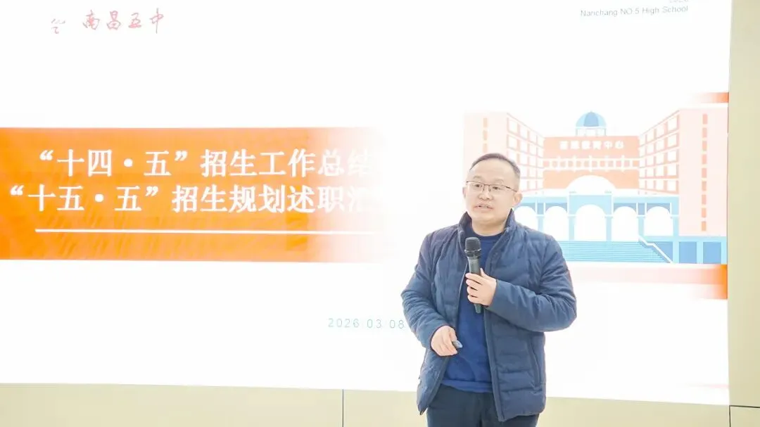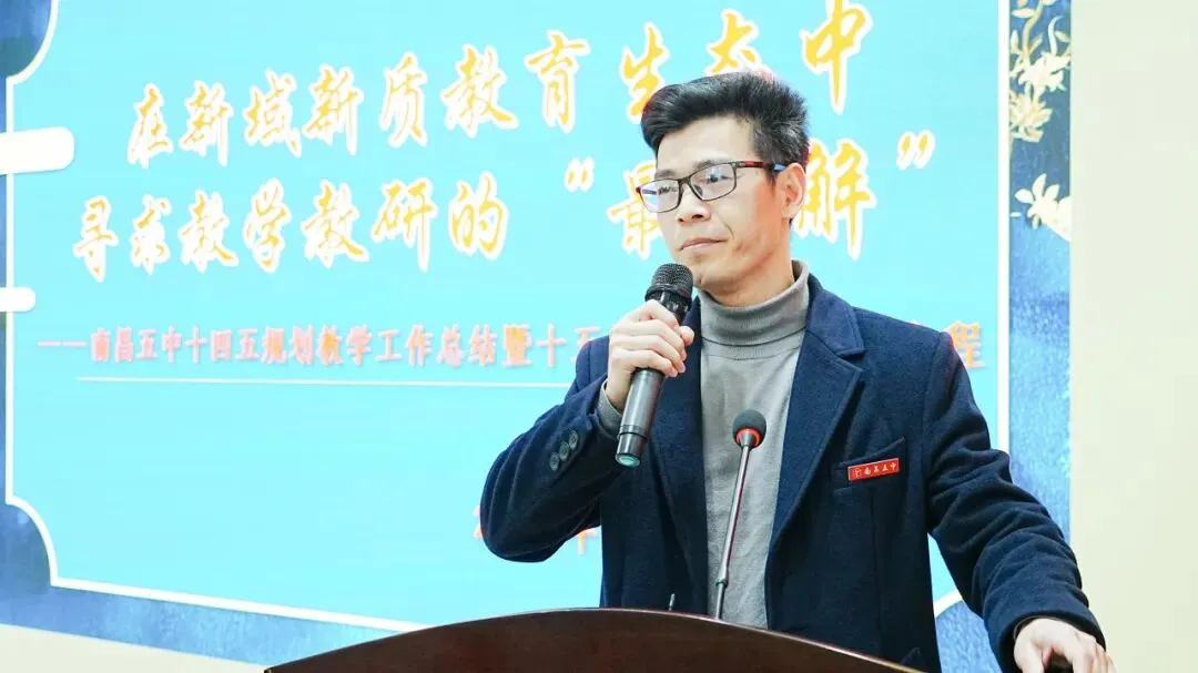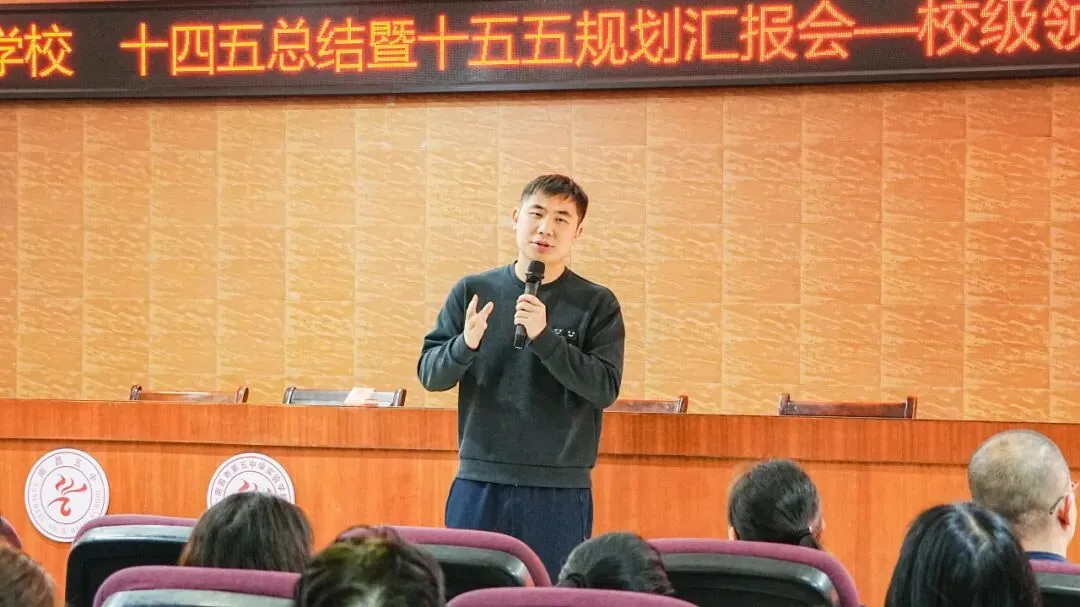 五中副校长尤伟峰以“在新域新质教育生态中,寻求教学教研的‘最优解’”为述职主题,围绕教育发展方向、教师队伍建设、教学质量提升、拔尖创新人才培养等核心工作展开系统阐述。汇报紧扣国家“双一流”高校扩招的政策背景,全面复盘了学校在“十四五”期间的发展实践,既总结了学校在课程改革、命题能力建设、教师梯队培育等教学教研工作中的成效与成果,也直面当前工作存在的短板不足。