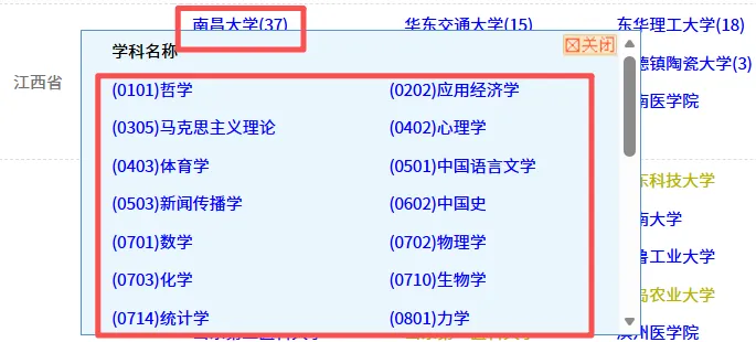 哲学、应用经济学、马克思主义理论、心理学、体育学、中国语言文学、新闻传播学、中国史、数学 、物理学、化学、生物学、统计学、力学、机械工程、材料科学与工程、动力工程及工程热物理、电气工程、信息与通信工程、控制科学与工程、计算机科学与技术、建筑学、土木工程、水利工程、化学工程与技术、环境科学与工程、食品科学与工程、网络空间安全、基础医学、公共卫生与预防医学、药学、护理学、工商管理学、公共管理学、信息资源管理、设计学、口腔医学专硕
