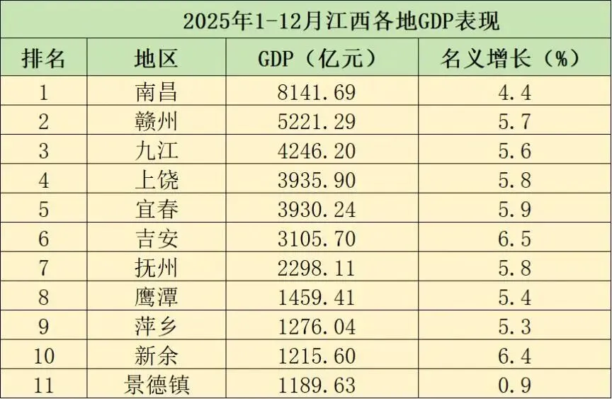 南昌2025年GDP为8141.69亿,名义增长4.4%。南昌的GDP增长表现较好,其总量也顺利突破八千亿大关。作为省会,南昌的GDP增长对全省的经济有较大的推动。江西也要加快强省会战略的实施,这将推动南昌经济再上一个台阶。