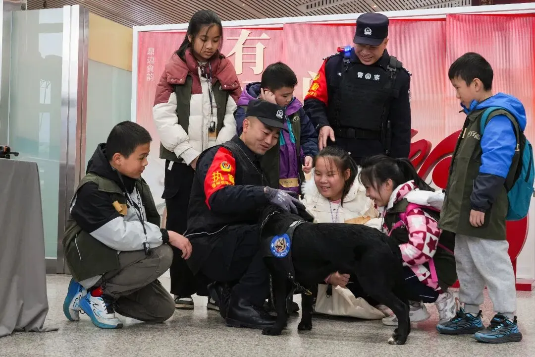 故事:警犬“上岗”,萌娃“围观”。福州铁路公安处民警带着警犬与孩子们近距离互动,在欢声笑语中传递安全知识,守护孩子们的成长之路。