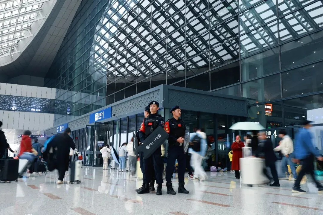 故事:赣州西站进站口,三名特警队员静立岗哨,身后是旅客匆匆的虚影,一动一静间,黑色身影以不变的姿态守护着每一程奔赴。