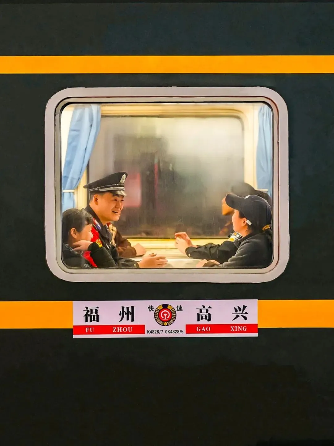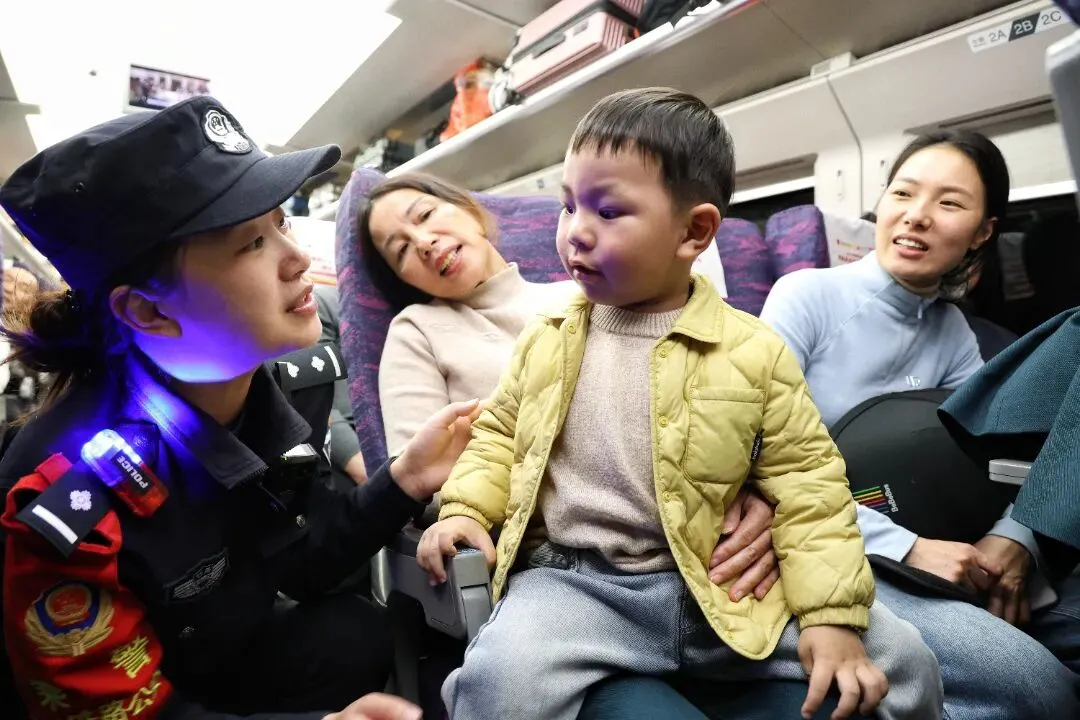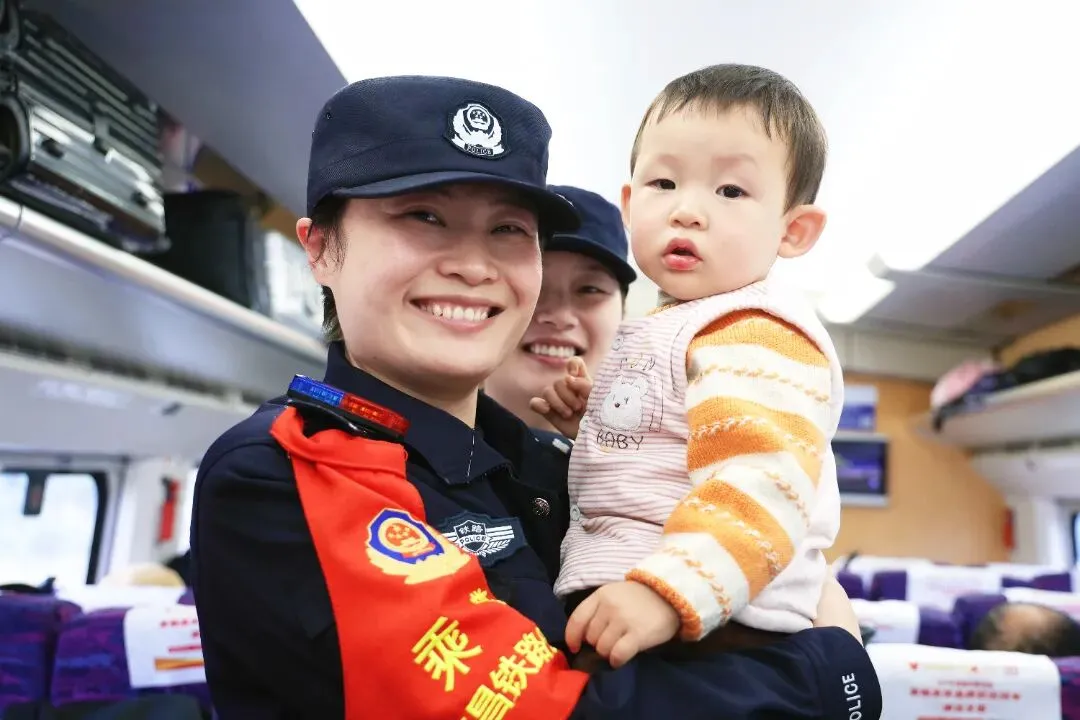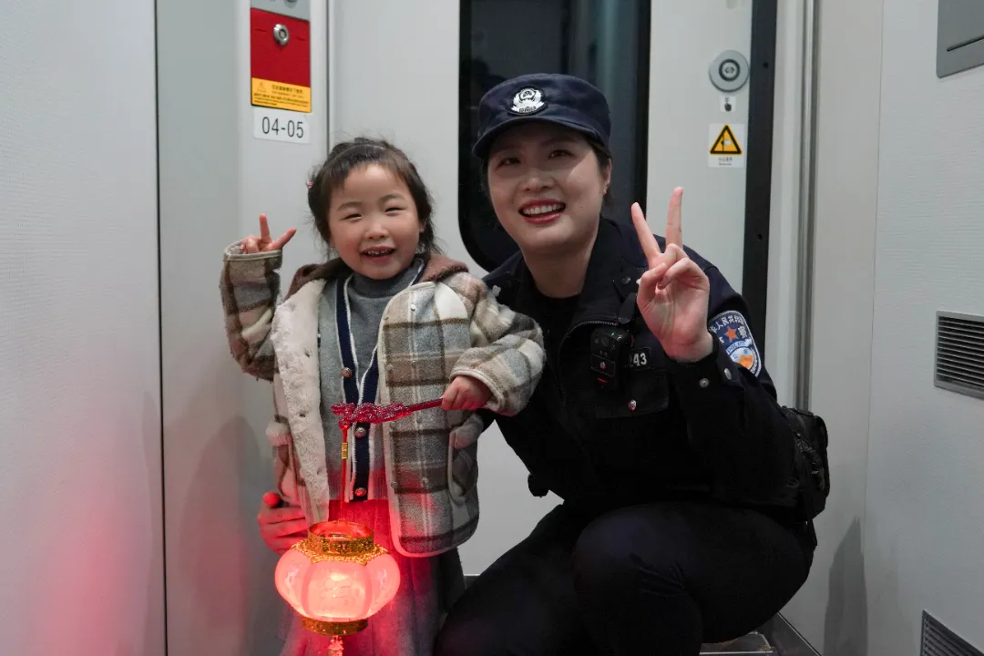 故事:小女孩手中的花灯映亮了童真,民警肩头的责任守护着归途。这张定格在飞驰列车上的合影,是节日里最动人的温情瞬间。