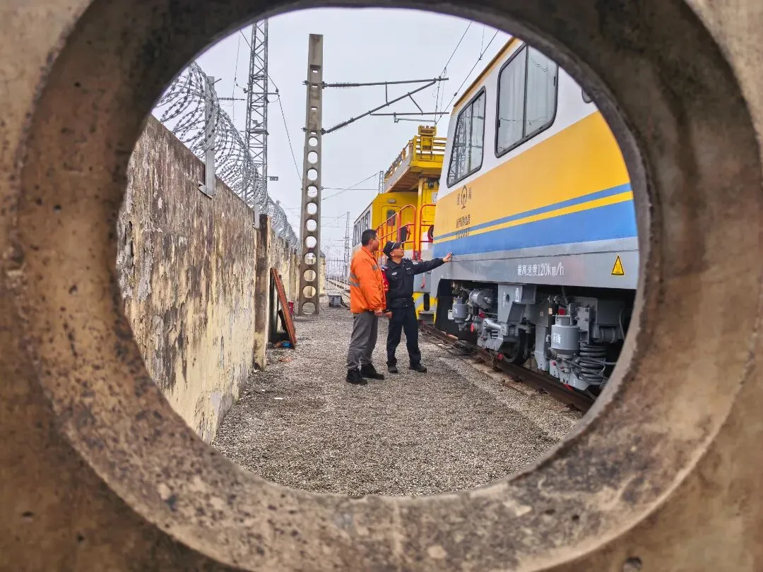 故事:透过铁路电杆的圆形孔洞,新干东站派出所民警正和工人在列车旁进行安全检查。