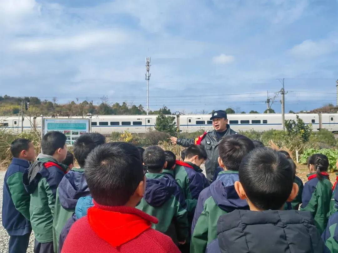 故事:新学期,南昌北站派出所民警组织沿线学生到线路外开展安全知识宣传。