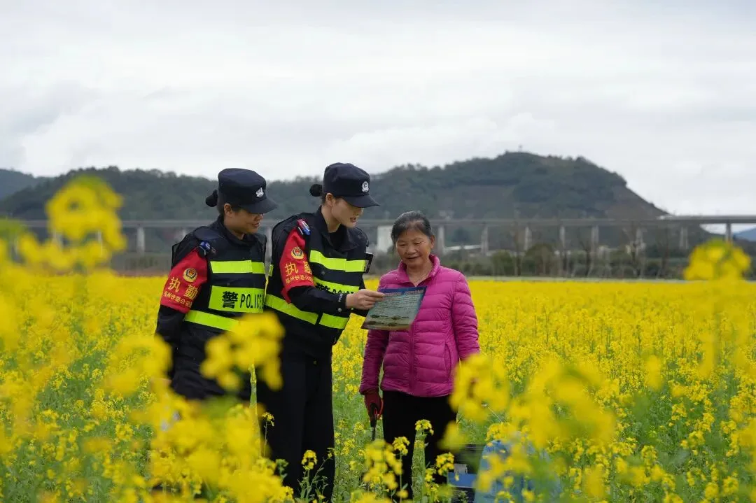 故事:春运期间,福州铁路公安处民警走进铁路沿线的田埂,对沿线居民开展法治安全教育。