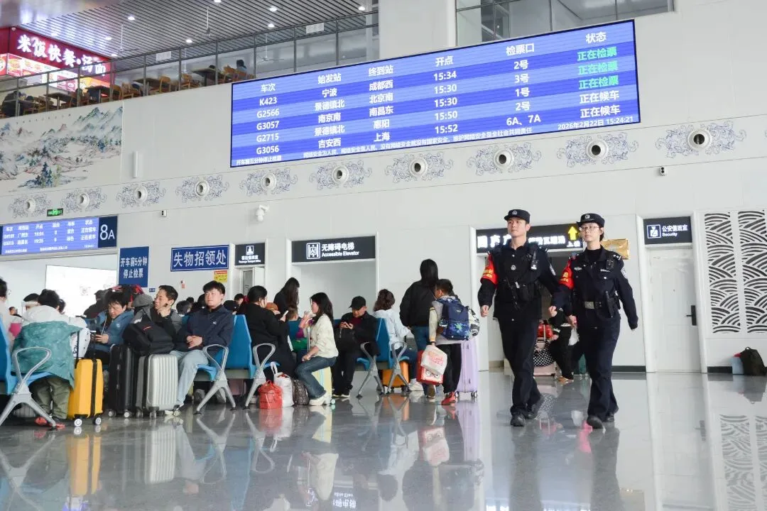 故事:春运期间,景德镇北站派出所民警在候车室开展巡逻巡控。