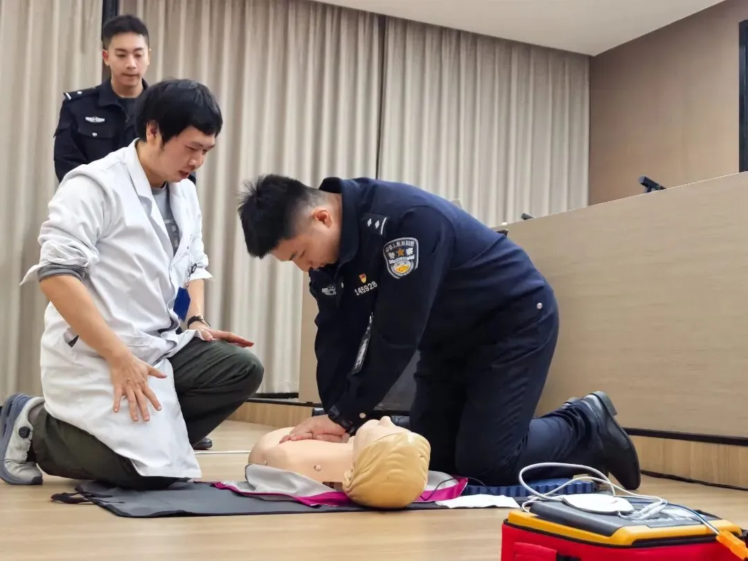 故事:为提升民警应急救护本领,福州铁路公安处邀请医生进警营讲授健康知识,组织体外除颤仪规范操作培训。