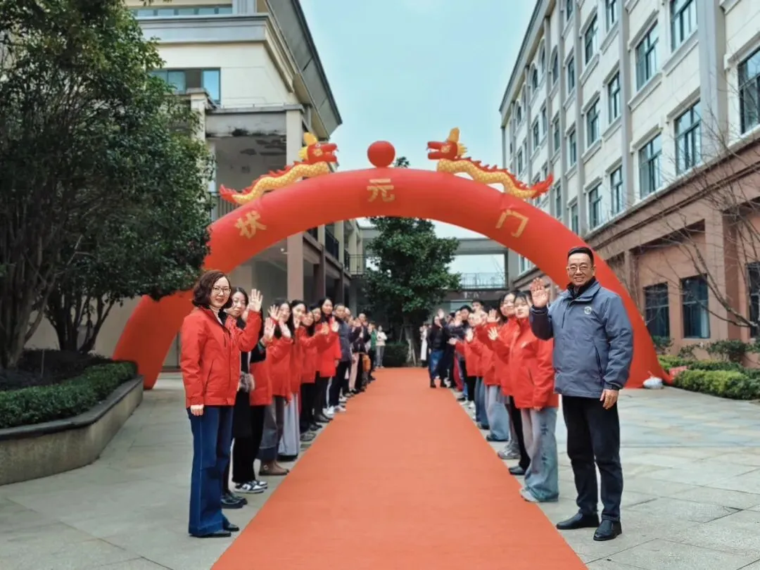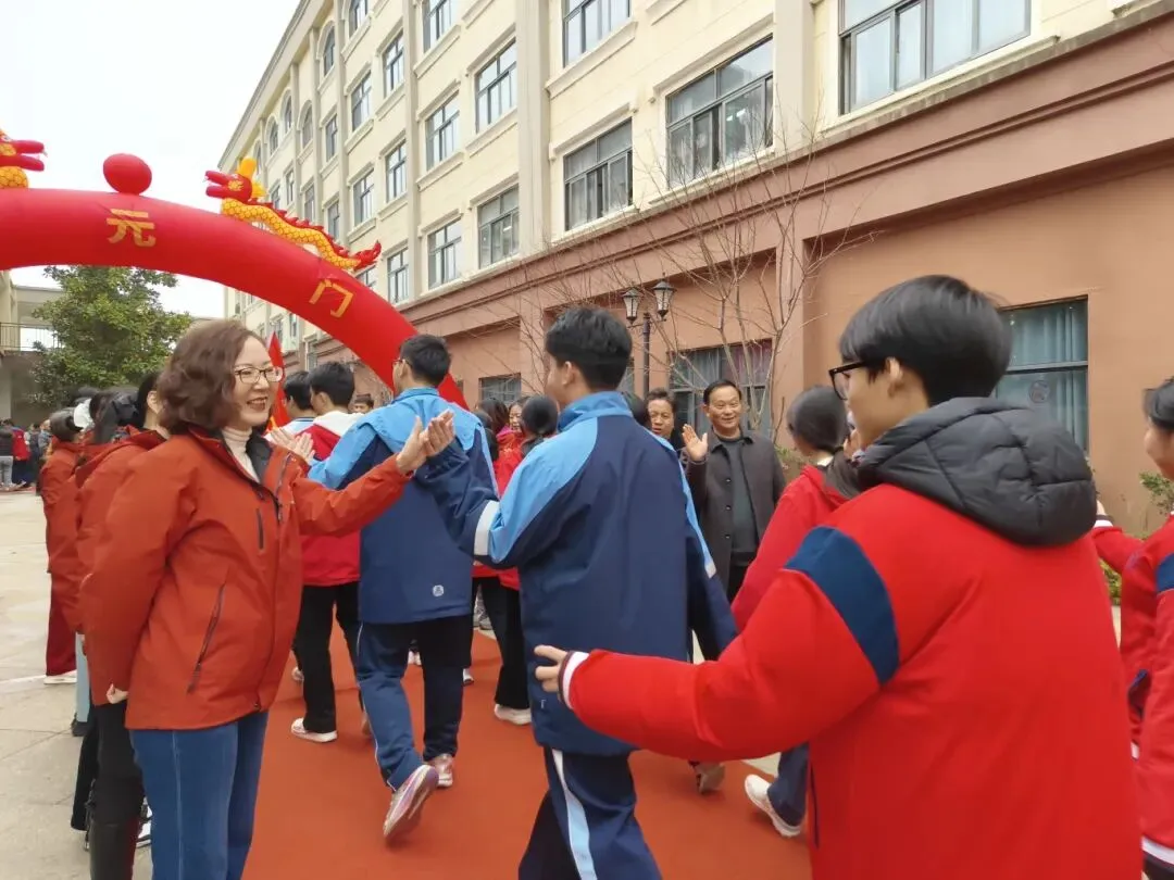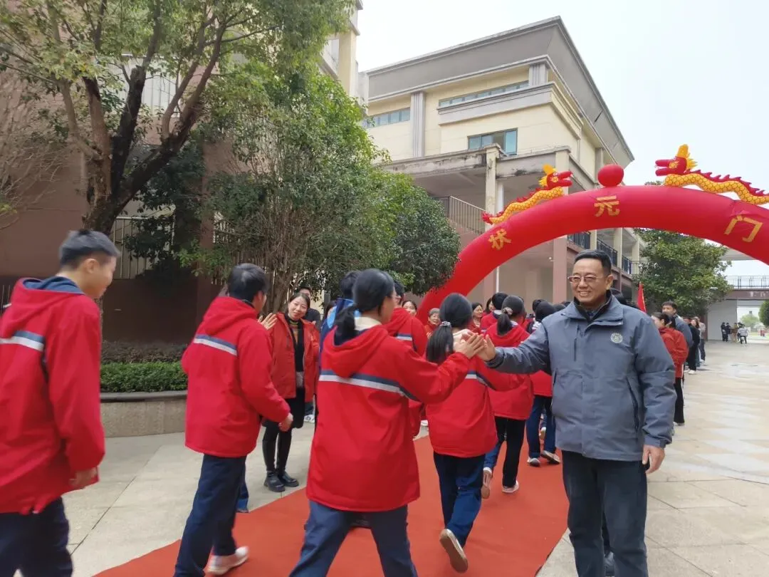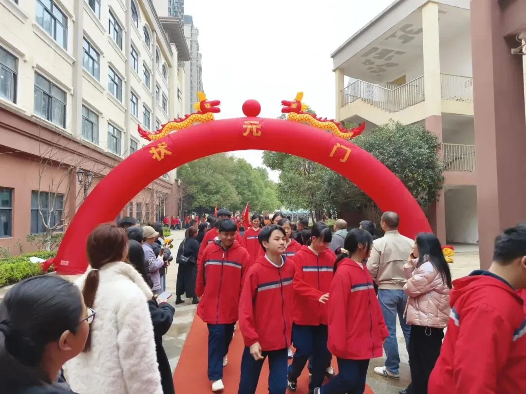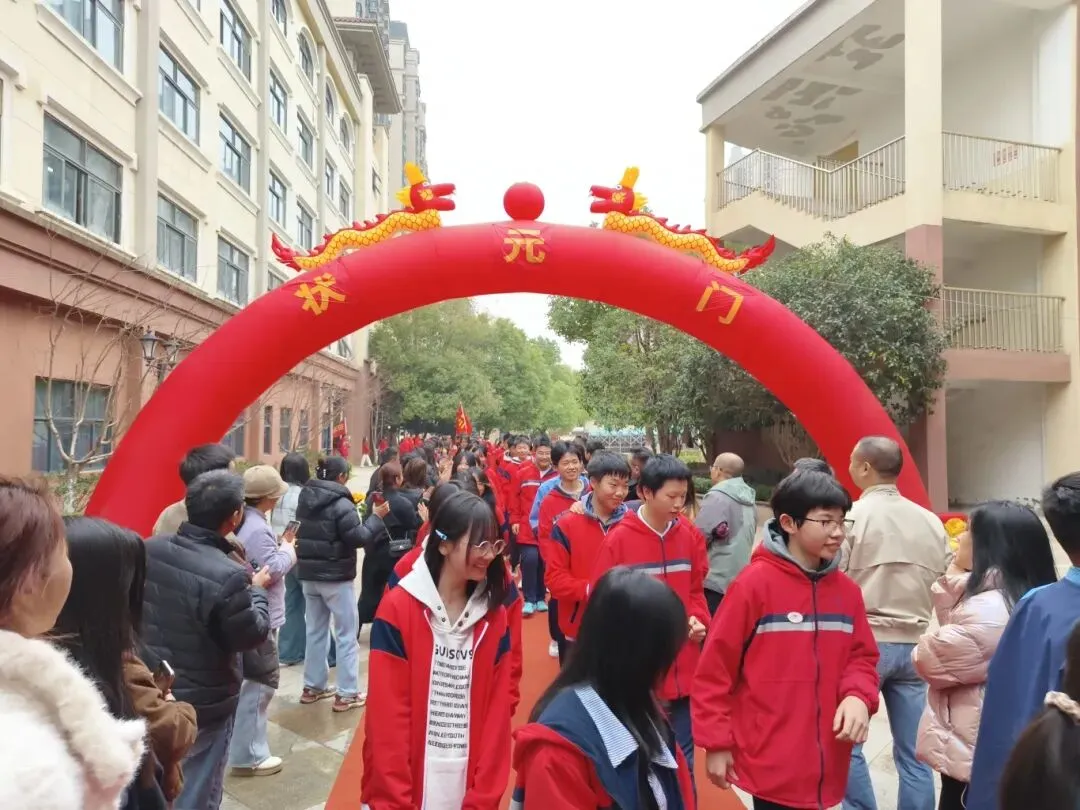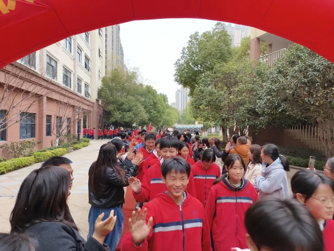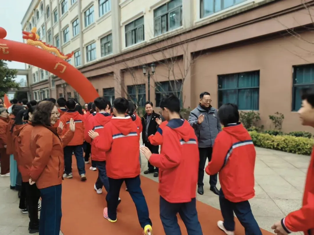下午15时58分,悠扬激昂的入场音乐中,誓师大会拉开序幕。初三学子身着统一校服,精神抖擞、身姿挺拔,满是朝气与斗志。在校领导、老师和家长的掌声中,学子们在班主任引领下,高举班旗,迈着坚定步伐踏上红地毯,穿越“状元门”。每一步都踏出青春力量,每个身影都承载梦想期许。少年目光坚毅、神情赤诚,这场入场仪式是中考预演,更是逐梦宣言。