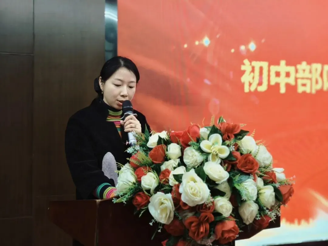 大会现场,初中部副校长叶歆登台为大会致辞,致辞内容温暖有力、鼓舞人心。“百日虽短,却足以查漏补缺、蜕变成长;备考虽苦,更能磨砺意志、沉淀初心。”叶校长鼓励同学们放下包袱、轻装上阵,专注当下、全力以赴,不负青春,坚持到底。同时感谢全体老师与家长的辛勤付出与支持,并承诺学校将全程守护,用心护航每一位学子,祝愿同学们六月金榜题名,圆梦中考!
