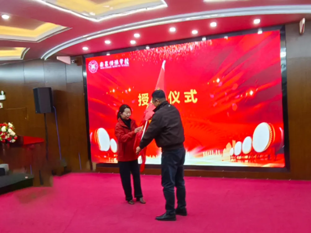 执行校长何源将印有 “2026 中考旗开得胜” 的战旗郑重授予年级组长何玲玲老师。