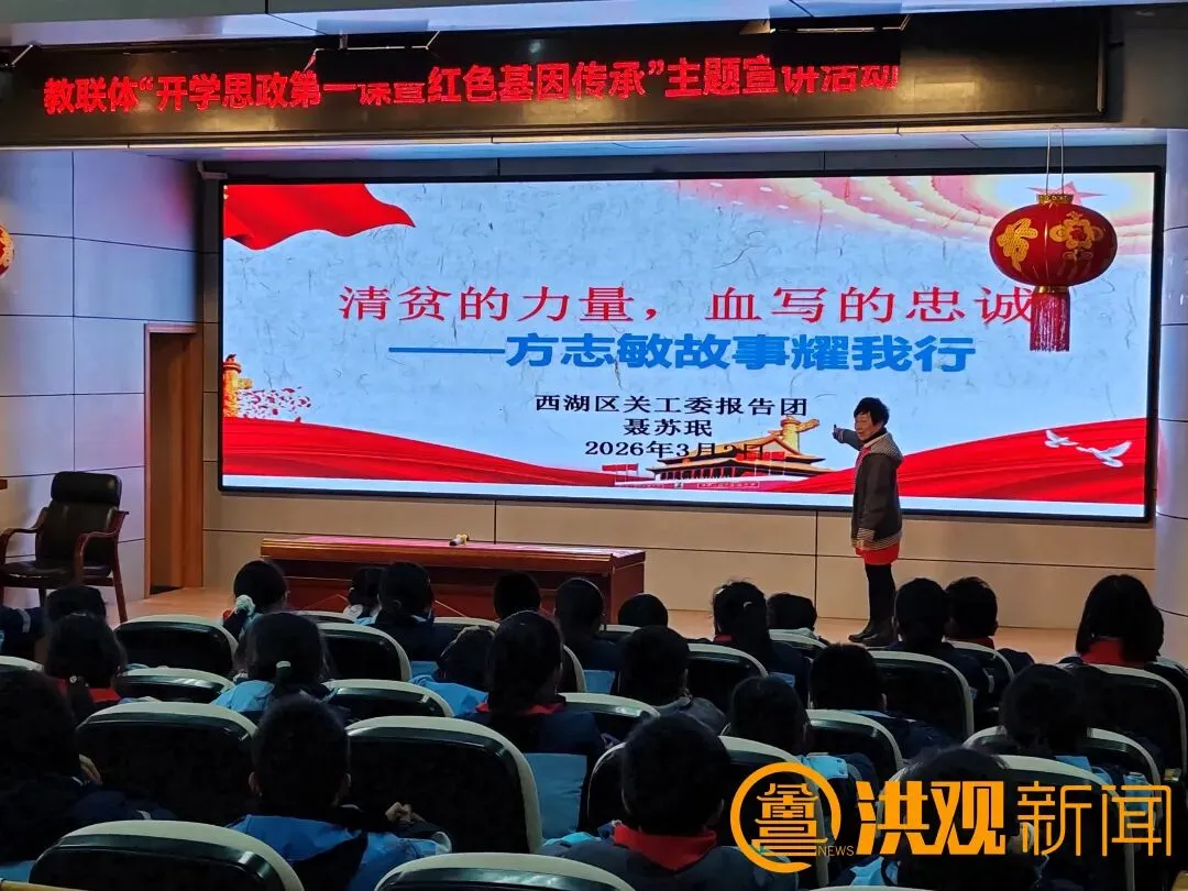 一问一答间,掌声四起。这堂特殊的“开学第一课”,没有照本宣科,没有生硬说教,有的只是老少之间的心灵对话,是南昌红色基因的自然流淌。来自西湖区关爱报告团的聂苏珉,刚刚获得全省“五老话江西”思政精品课一等奖。她把方志敏的革命故事与江西红色热土、新时代发展成就巧妙串联,配合课件展示和互动问答,让孩子们在聆听中感悟。讲到动情处,她带领全场人员齐诵《可爱的中国》节选。稚嫩的童声与沧桑的嗓音交织在一起,在教室里久久回荡。