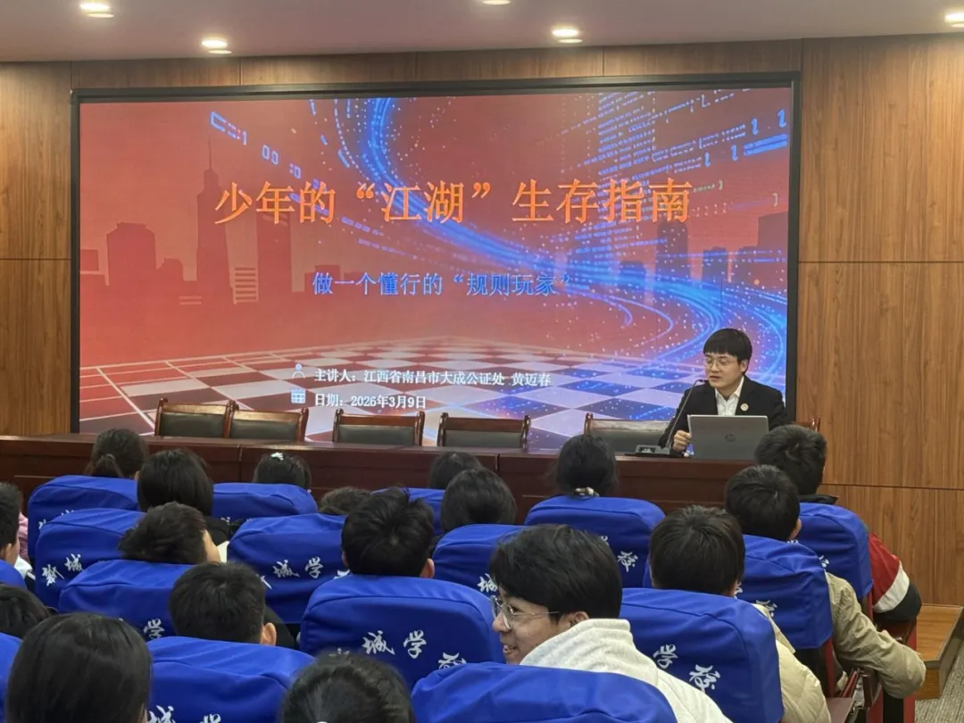 为进一步筑牢校园法治安全防线,切实增强青少年法治意识与自我保护能力,3月9日,新城学校特邀南昌市大成公证处黄迈春走进一部校区,为同学们带来一堂内容充实、针对性强的法治专题讲座,引导广大学生知法、懂法、守法、用法,争做守规则、明底线的新时代青少年。