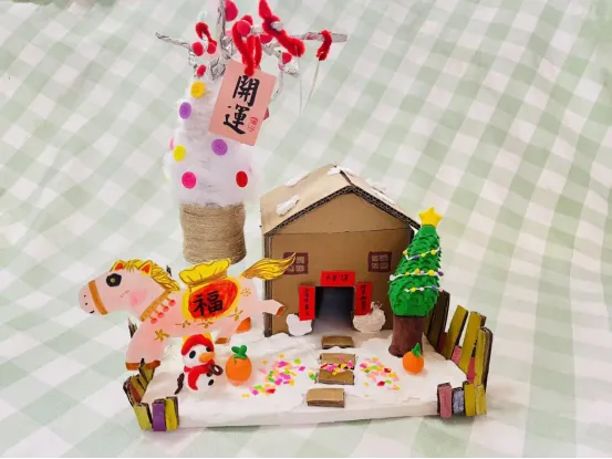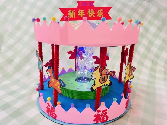 粉粉的皇冠顶像公主的帽子,上面还坐着好多彩色小绒球~红色的扭扭棒柱子之间,有小马儿在快乐奔跑!中间的玻璃罐里藏着会发光的星星串,一打开就像撒了一把小星星,底座的绿草地和粉色围边上的“福”字,让整个木马都充满了新年的魔法呀!