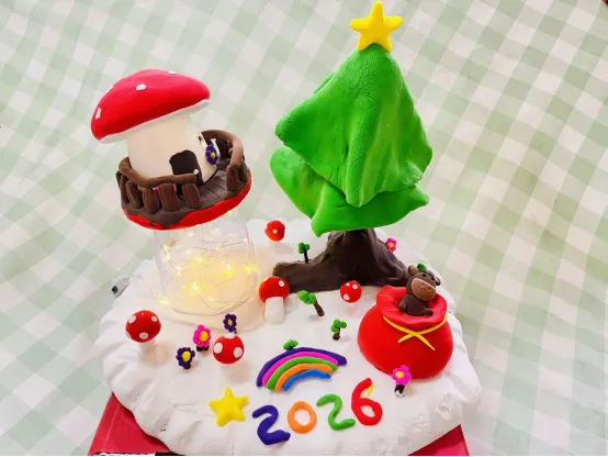 红帽子蘑菇屋带着棕色小阳台,下面星星罐会发光~旁边绿松树顶着星星王冠,红袋子里钻出圆滚滚小马。周围有红点点蘑菇、彩虹小花和彩色"2026",像裹着棉花糖的童话世界,藏满甜甜的小心愿!