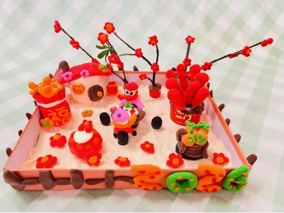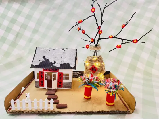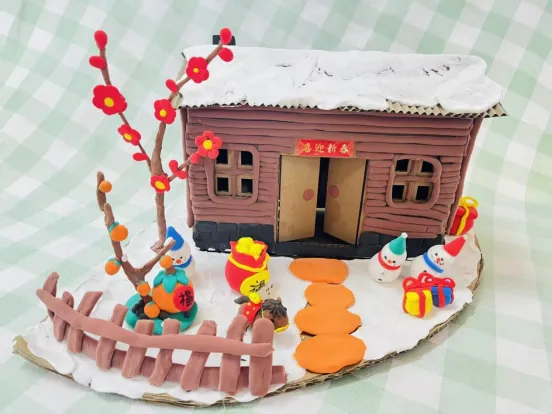 小房子戴雪帽子,门上贴着“恭喜发财”红对联~旁边梅枝开着小红花,福字瓶子会发光!红鞭炮插着彩色流苏,小白栅栏边还有兔子乖乖坐着,像下雪天里暖暖的新年小院子!