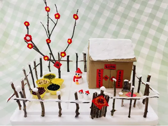 雪白雪白的屋顶上积着棉花糖似的雪,红红的对联上写着对家人的祝福。小院里,小雪人戴着红帽子,可爱极了,还有那几碗五谷,寓意着丰收满满。红梅点点,福字挂枝,整个场景满是新年的喜庆与温馨,福气都要溢出来啦!