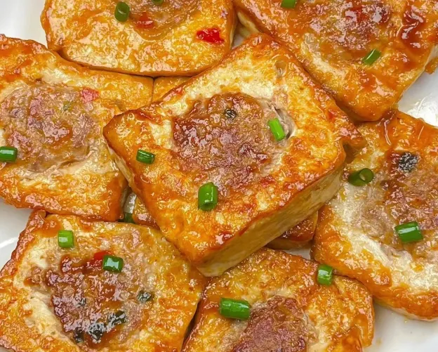 【奉新酿豆腐】这菜看着糙,吃着细。老豆腐切大块,中间挖空,塞进剁碎的猪肉馅。关键不在肉,在于那个"酿"的过程。先用油把豆腐两面煎得焦黄起皮,锁住水分,再加高汤小火慢炖。出锅前撒一把葱花,咬一口,豆腐的豆香混着肉汁的鲜,在嘴里直接炸开,烫嘴也舍不得吐。