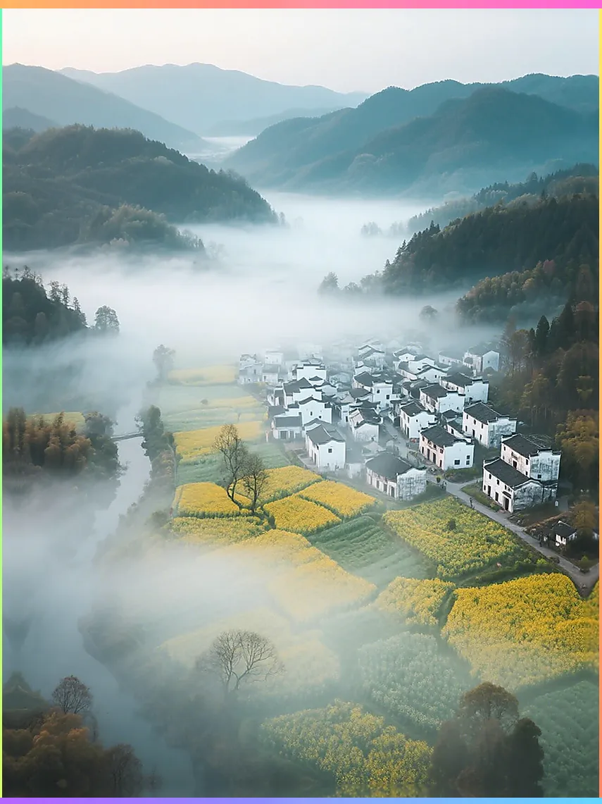 粉墙黛瓦的倒影,在水面懒懒地漂着。清晨山间的雾气,和村口早点的炊烟缠在一起,分不清哪是云,哪是人间。