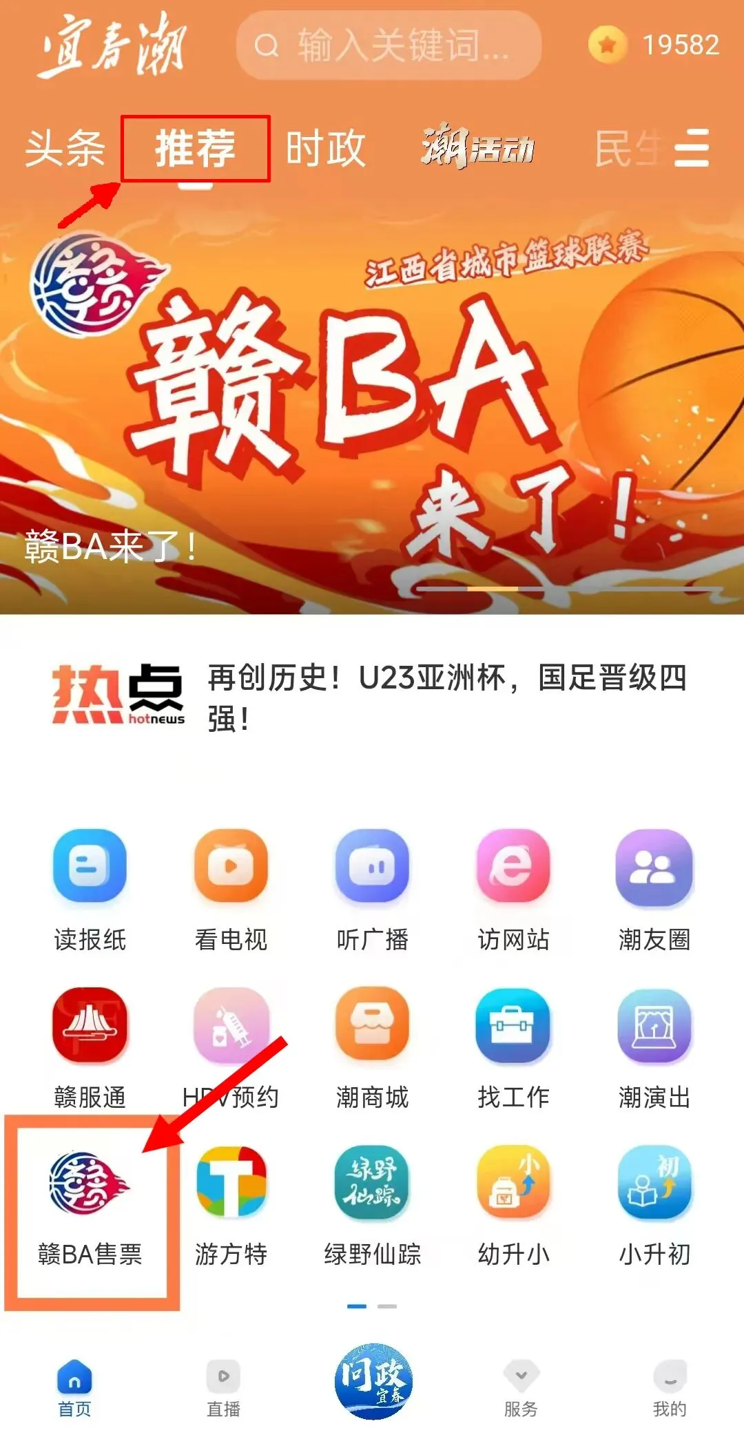 ②登录后,在首页“推荐”中点击“赣BA售票”入口