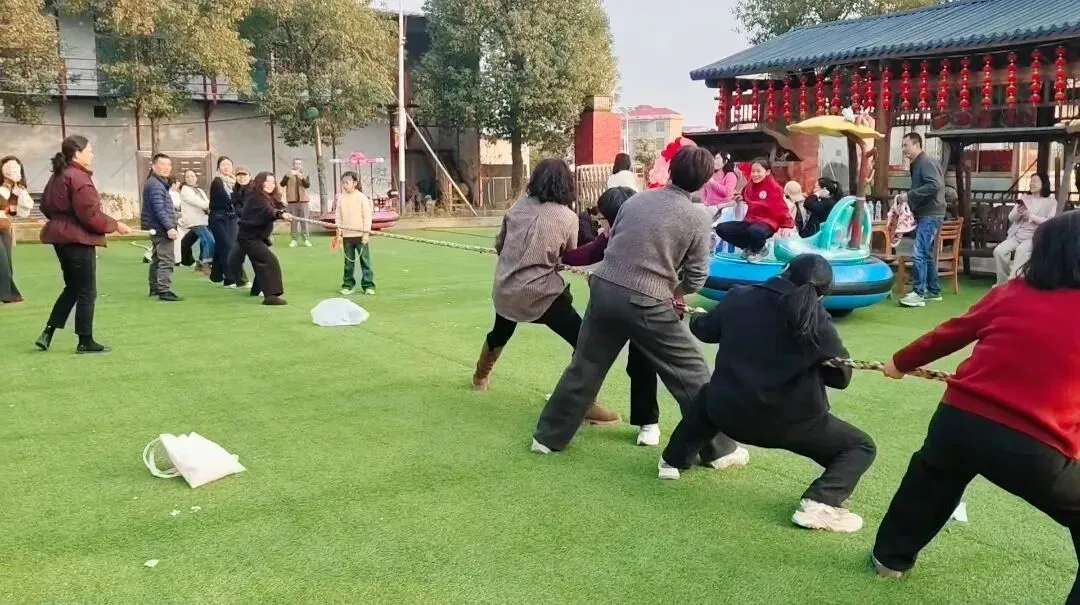 趣味互动环节将气氛推向高潮。蒙眼喂香蕉、母鸡下蛋、拔河比赛等游戏热闹开场,大人孩子齐上阵,欢声笑语此起彼伏。大家默契配合、奋勇争先,在游戏中拉近了距离、增进了情谊,现场处处洋溢着温馨欢乐的氛围。