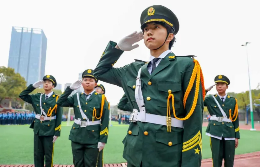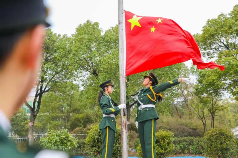仪式在庄严的升旗仪式中拉开帷幕,国旗护卫队精神抖擞、护旗出旗,五星红旗冉冉升起,全体师生肃立注目,尽显民德学子的朝气与担当。