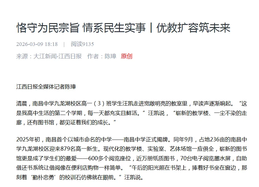 从九龙湖畔到未来科学城,一座座现代化的新校园拔地而起,让越来越多的南昌学子在家门口就能上好学。正如南昌市教育部门相关负责人所说:“教育是国之大计,我们要用实打实的项目建设,托举起每一个孩子的成才梦想。”这正是南昌书写教育惠民答卷最生动的注脚。