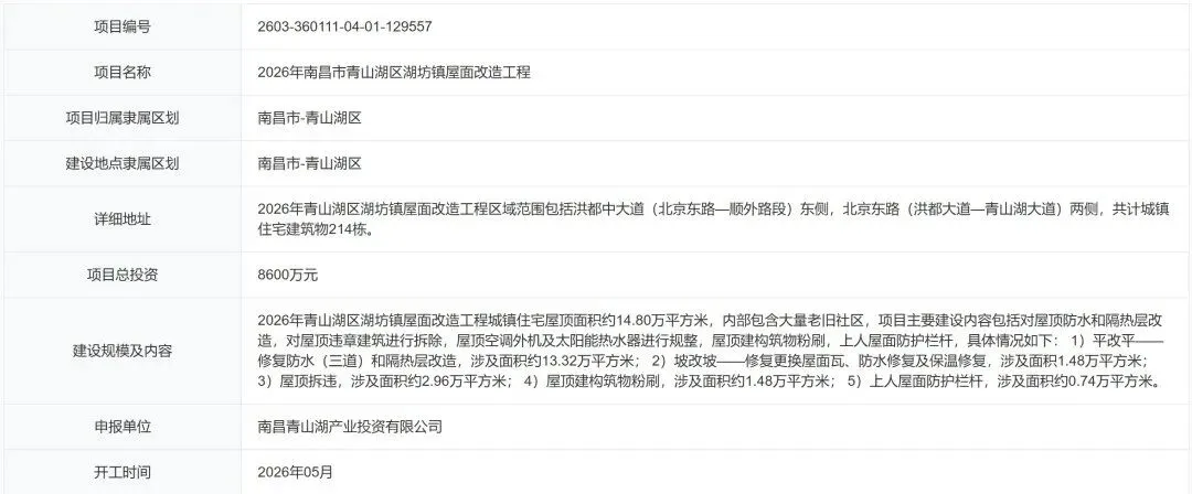 近日,江西省投资项目在线审批监管平台公示了2026年南昌市青山湖区湖坊镇屋面改造工程备案信息,项目编号为2603-360111-04-01-129557。