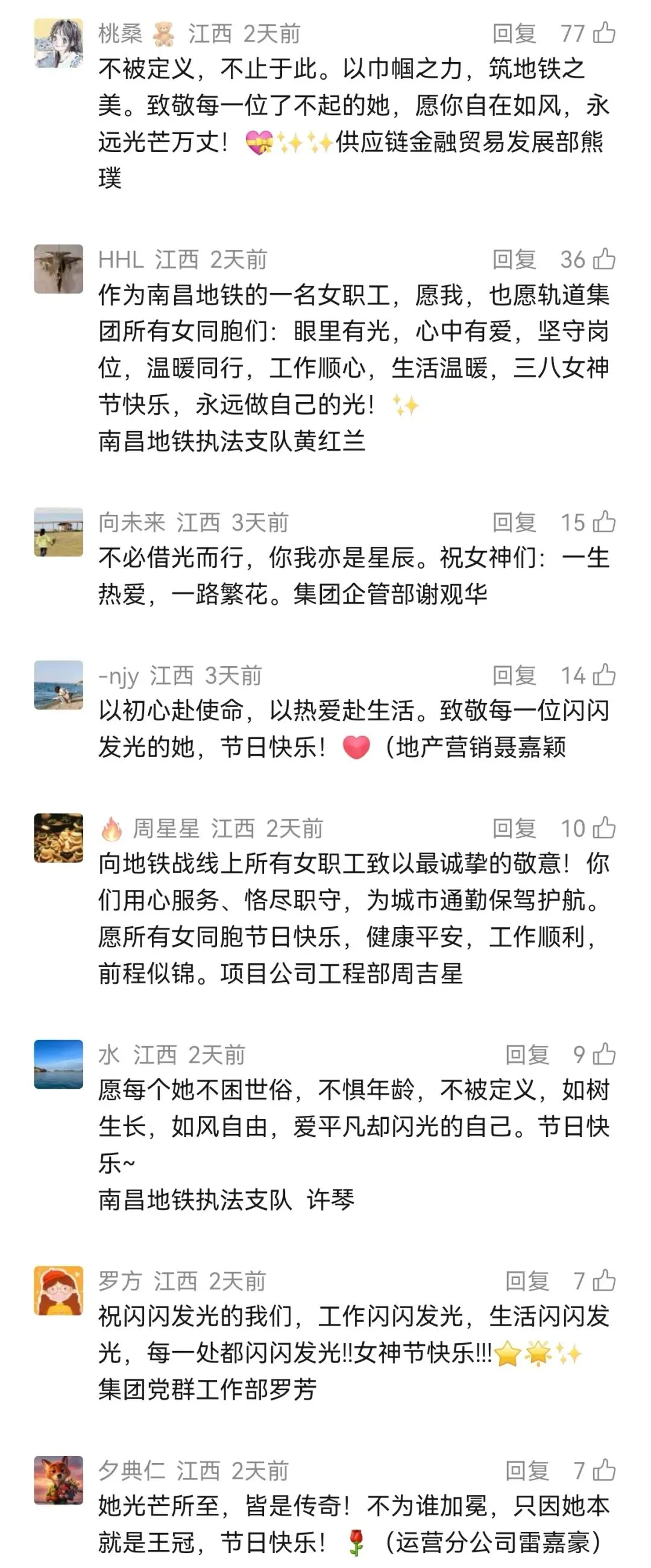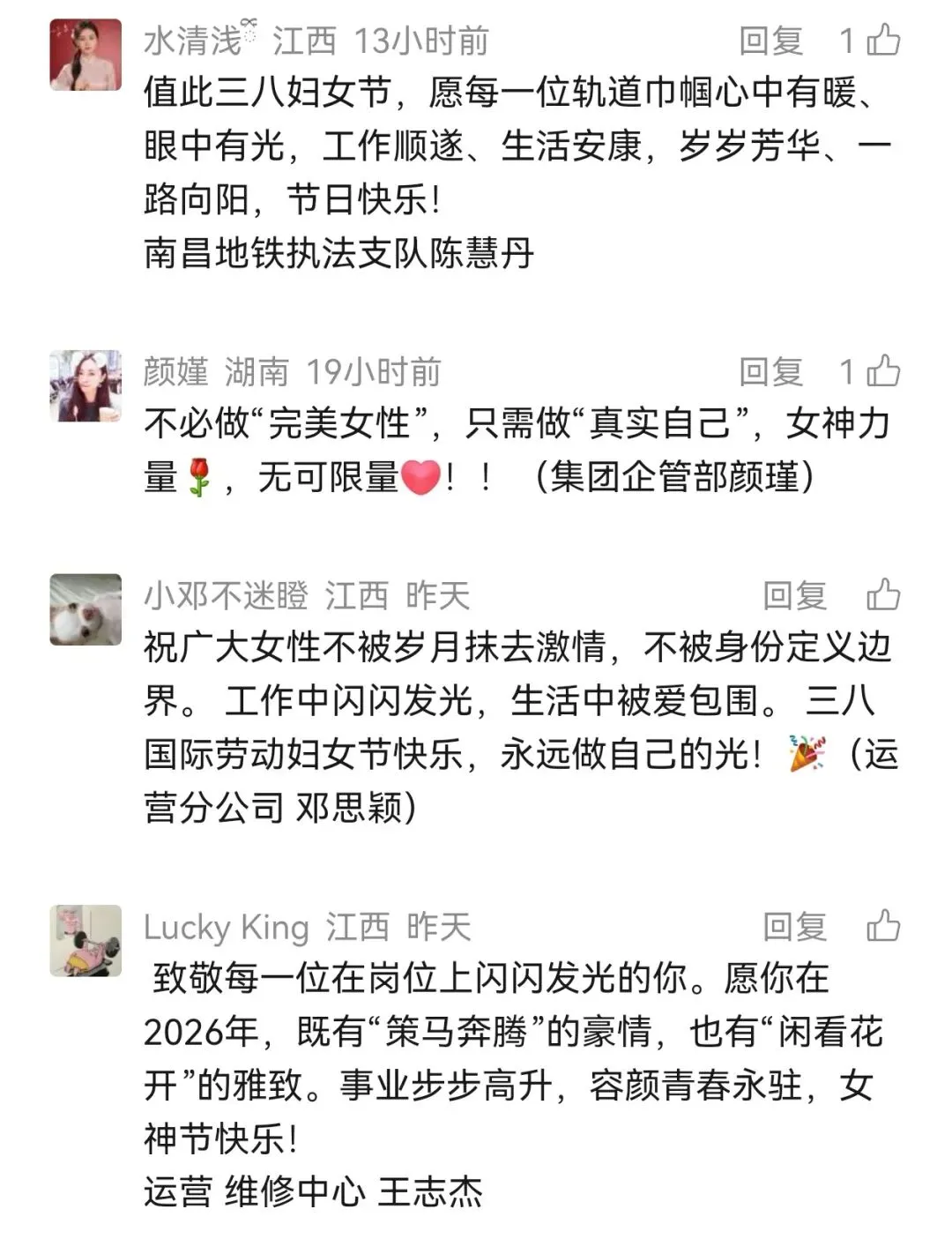 活动期间,大家踊跃留言、真诚点赞,一句句真挚祝福、一声声暖心致敬,字里行间满是对身边女性的赞美与认可,充分展现了南昌地铁大家庭温暖有爱的浓厚氛围,传递出向上向善、同心奋进的正能量。