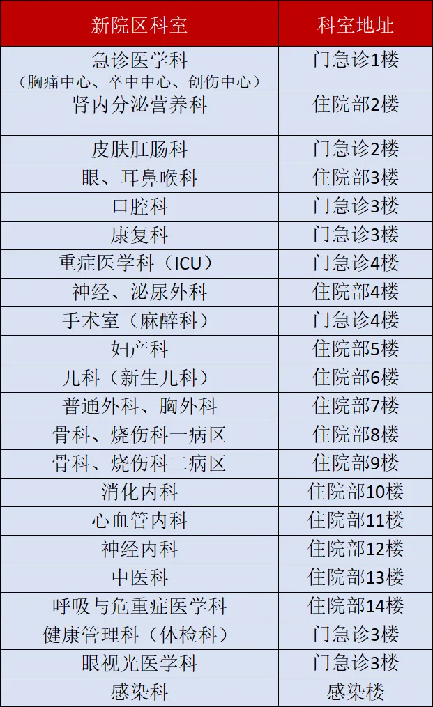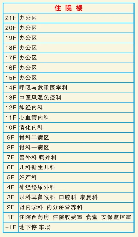 2.住院部:急诊(含创伤中心)、肾内科、内分泌科、营养科、康复科、眼科、耳鼻喉科、重症医学科、神经外科、泌尿外科、妇产科、儿科、新生儿科、普通外科、胸外科、骨科、烧伤科、消化内科、心血管内科、神经内科、中医科、风湿免疫科、呼吸与危重症医学科。