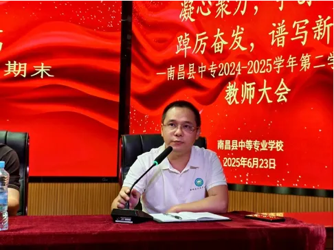 近日,南昌县中等专业学校在银三角校区召开2024-2025学年第二学期期末全体教师大会。会议由党支部书记、校长陶晓彬主持,全体教职工参会。大会总结本学期工作,部署假期任务,并明确新学期目标,深化产教融合,争创省级A档中职学校,探索综合高中部试点。
