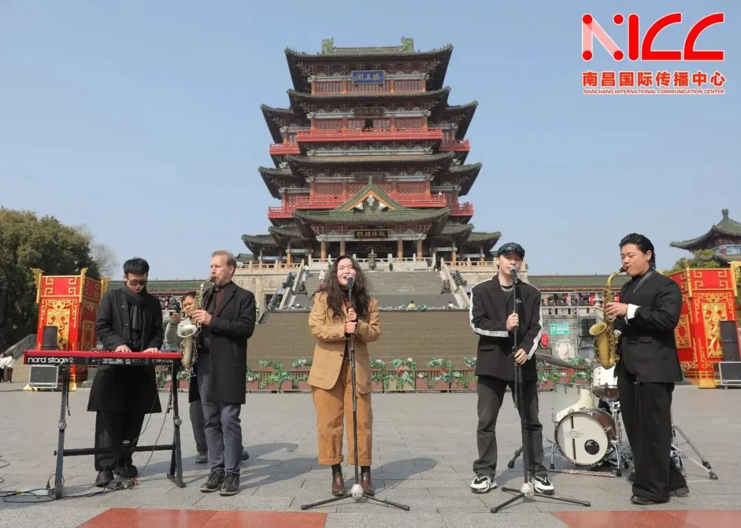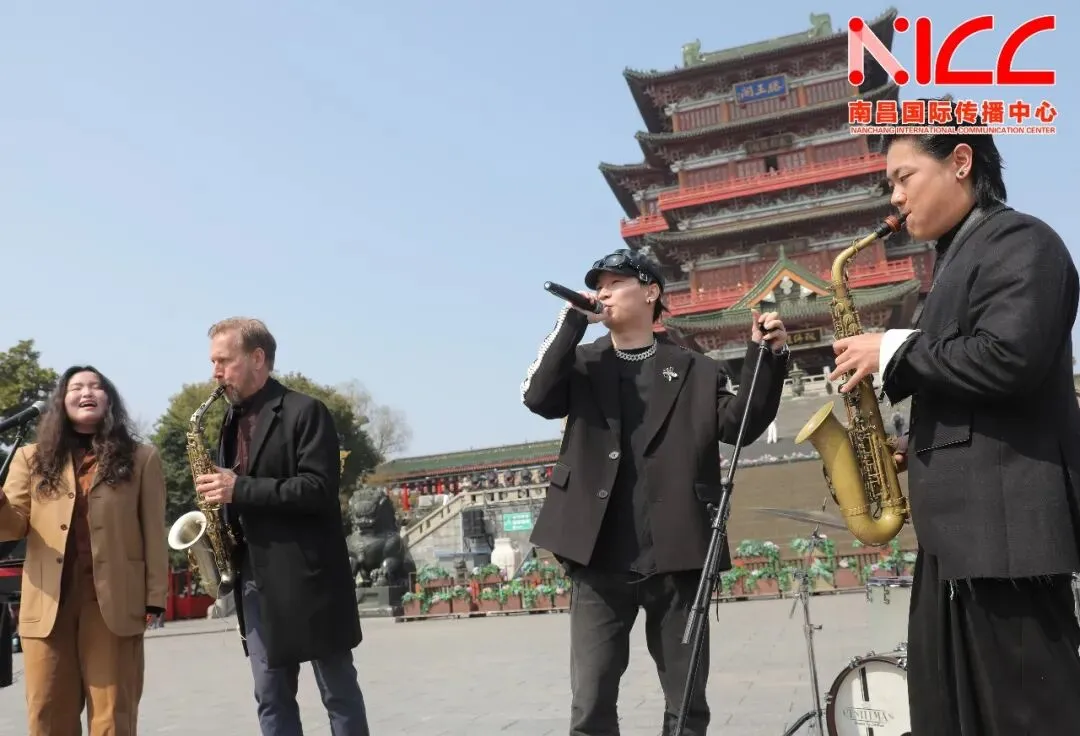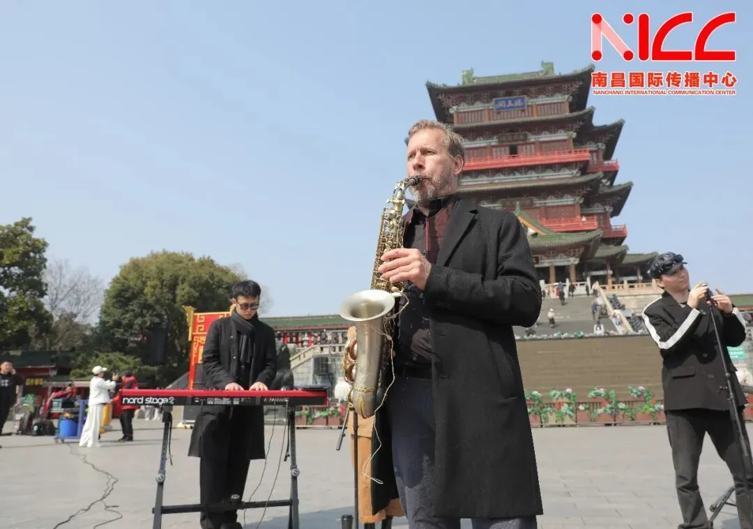 古阁飞檐下,金色的萨克斯吹奏出的悠扬音符在春风中流淌——3月10日,滕王阁前,一场跨越时空与文化的音乐对话热情上演。