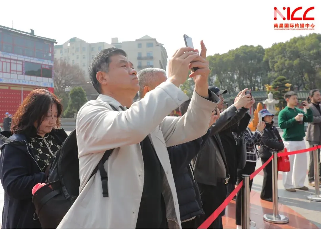 滕王阁临赣江而立,因王勃的《滕王阁序》而闻名,是“江南三大名楼”之一,也是南昌的地标。从一层到五层,佩卡聆听讲解员讲述王勃创作《滕王阁序》的故事,以及楼阁千年来的兴衰变迁。主阁一层序厅内,一尊汉白玉雕的《时来风送滕王阁》映入眼帘;门前的“落霞与孤鹜齐飞,秋水共长天一色”拱联,让人瞬间沉浸于千古名句的意境之中。五层是观景的最佳位置,中厅墙上铜板雕刻的《滕王阁序》前,佩卡驻足良久,细细端详那些他虽不认识、却能感受到韵律的汉字。